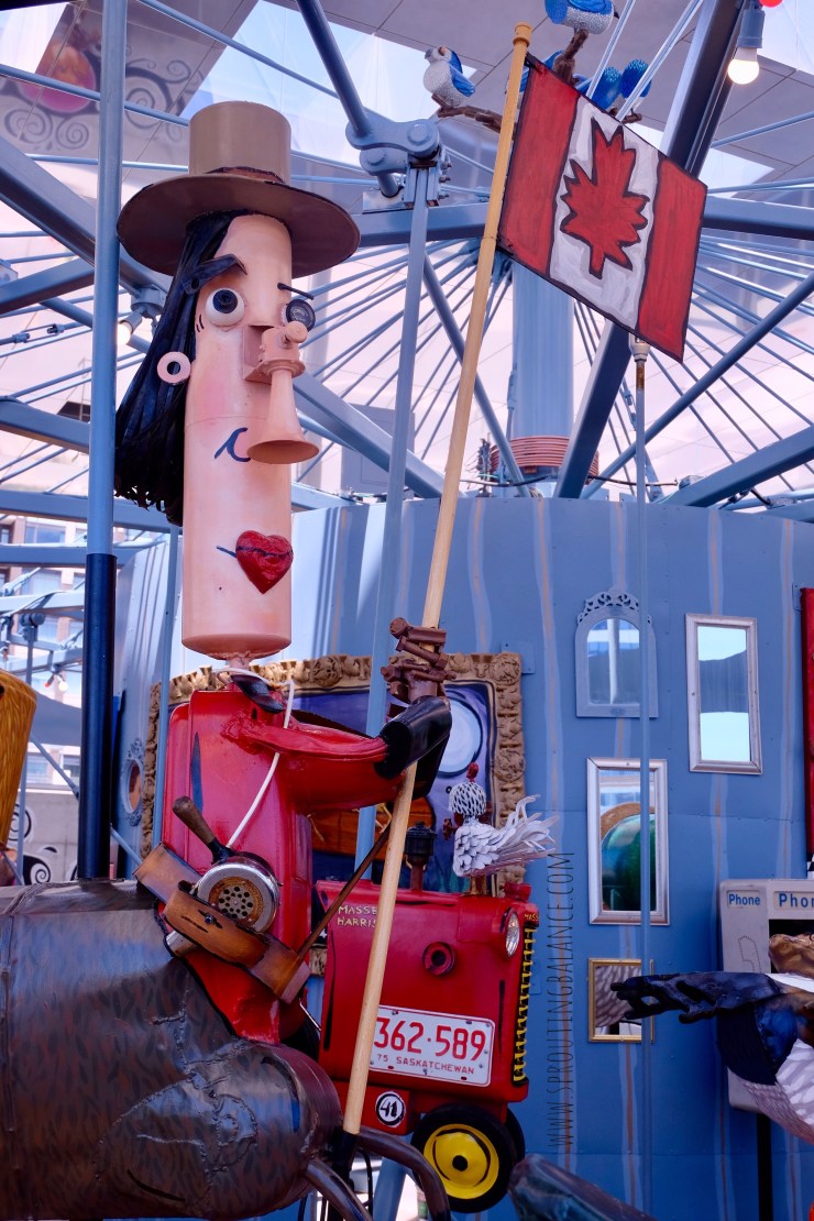 Another place for photo taking obsessed individuals to visit is the Pride of Canada Carousel in Markham. We were lucky enough to visit when no one was there. It was an overcast, steaming hot, threatening to rain kinda day but I still never thought we would be the only ones. Every time I have passed this place, it was busy. I say we were lucky because the individual running the carousel showed us around and pointed out the various highlights of the artists work. This isn’t an ordinary horse carousel – this is a Canadian theme representing all the provinces and territories and it is made out of recycled metal! Uber cool… and only $2.00 per ride!