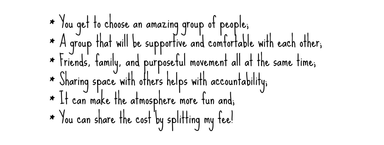Basically, working with me in a private session allows you to work on what makes sense for you at your own pace, at a time that is convenient for you, and in the comfort of your own home.